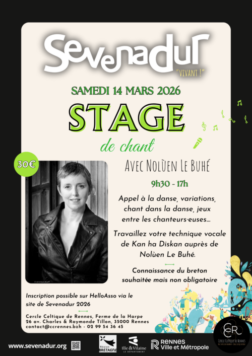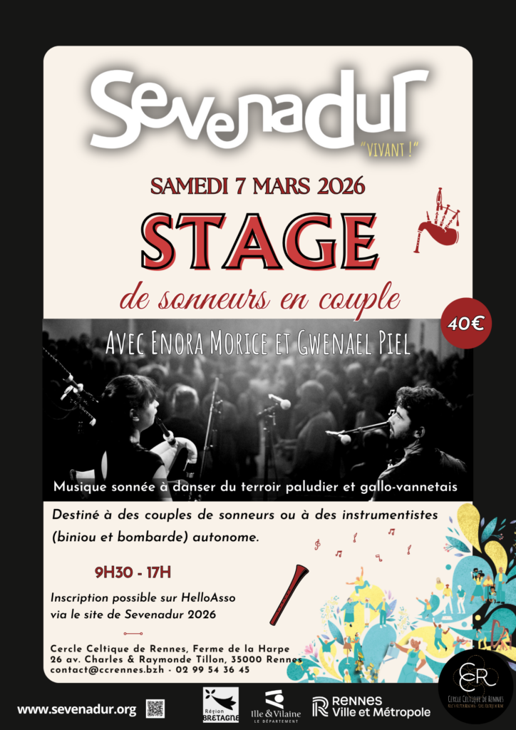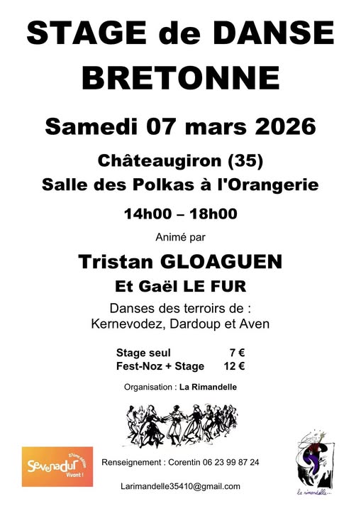 Samedi 7 mars – (14h – 18h) – Salle des Polkas à l’Orangerie Chateaugiron -Tarif : Stage seul : 7 euros, Fest-Noz + stage 12 euros – Renseignements : Larimandelle35410@gmail.com – Accès PMR