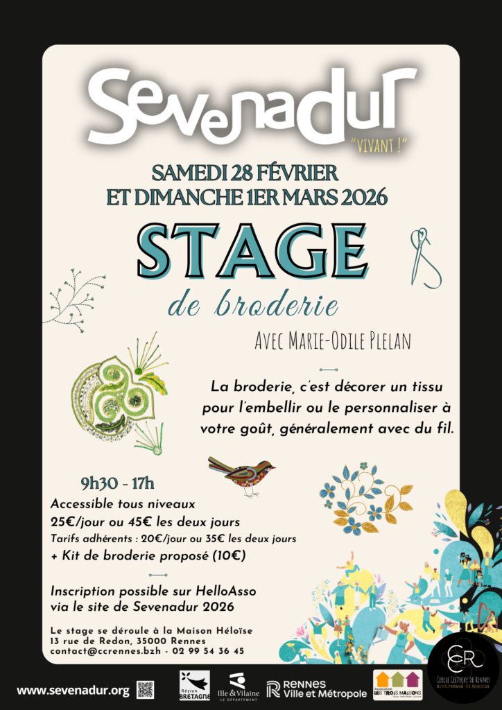 Samedi 28 février & dimanche 1er mars (9h30-17h, prévoir un repas), La Maison Héloïse – 13, rue de Redon, 35000 RENNES Métro : A (Arrêt Triangle) Bus : 13, 61 (Arrêt Triangle) – Tarif : Adhérents : 20€/jour 35€/2jours Tarif normal : 25€/jour ou 45€/2jours + kit 10 €– Renseignements : 02 99 54 36 45 / contact@ccrennes.bzh – accès PMR